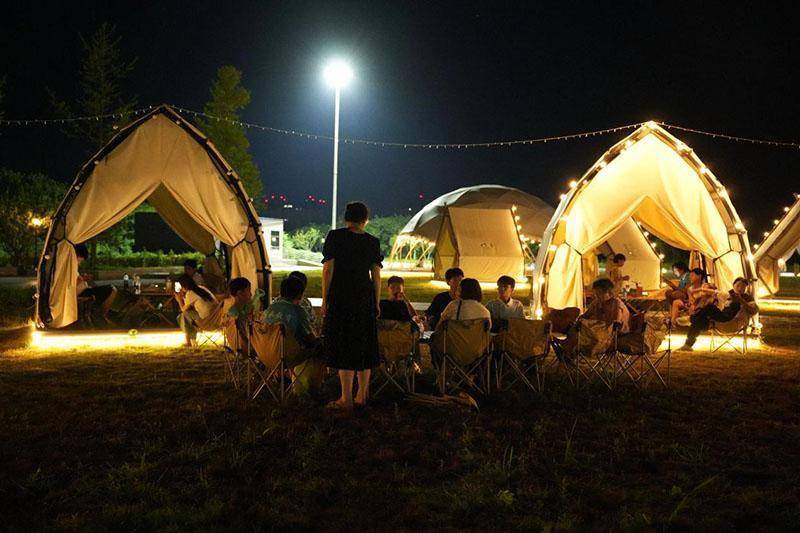 傍晚时分,露营地的烧烤区渐渐热闹起来,袅袅炊烟升起,烤肉的香气随风飘散。不少家庭、朋友围坐在烧烤炉旁,一边烤制美食,一边聊天说笑,暖黄的灯光下,氛围感十足。“特意和朋友提前预约了烧烤位,白天逛市集、看表演,晚上烤着肉、聊着天,这才是国庆假期该有的样子!” 游客张伟说。